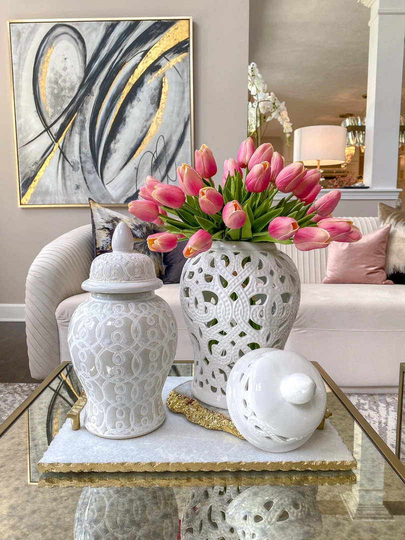 Description: This white beaded ceramic ginger jar is perfect for spring! It is 15″ tall and gives height to your vignette.