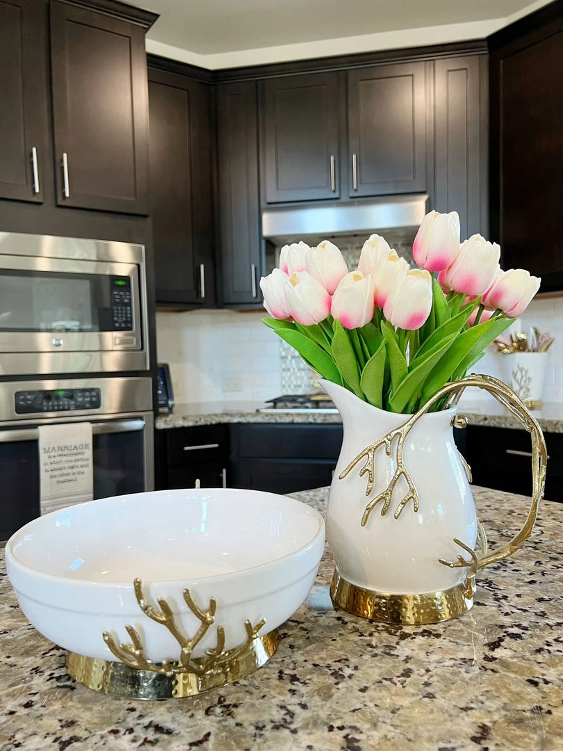 Description: This beautiful bowl is a great piece of elegant design. The gold textured details complement the glossy white ceramic to create a timeless look of sheer elegance and glam.