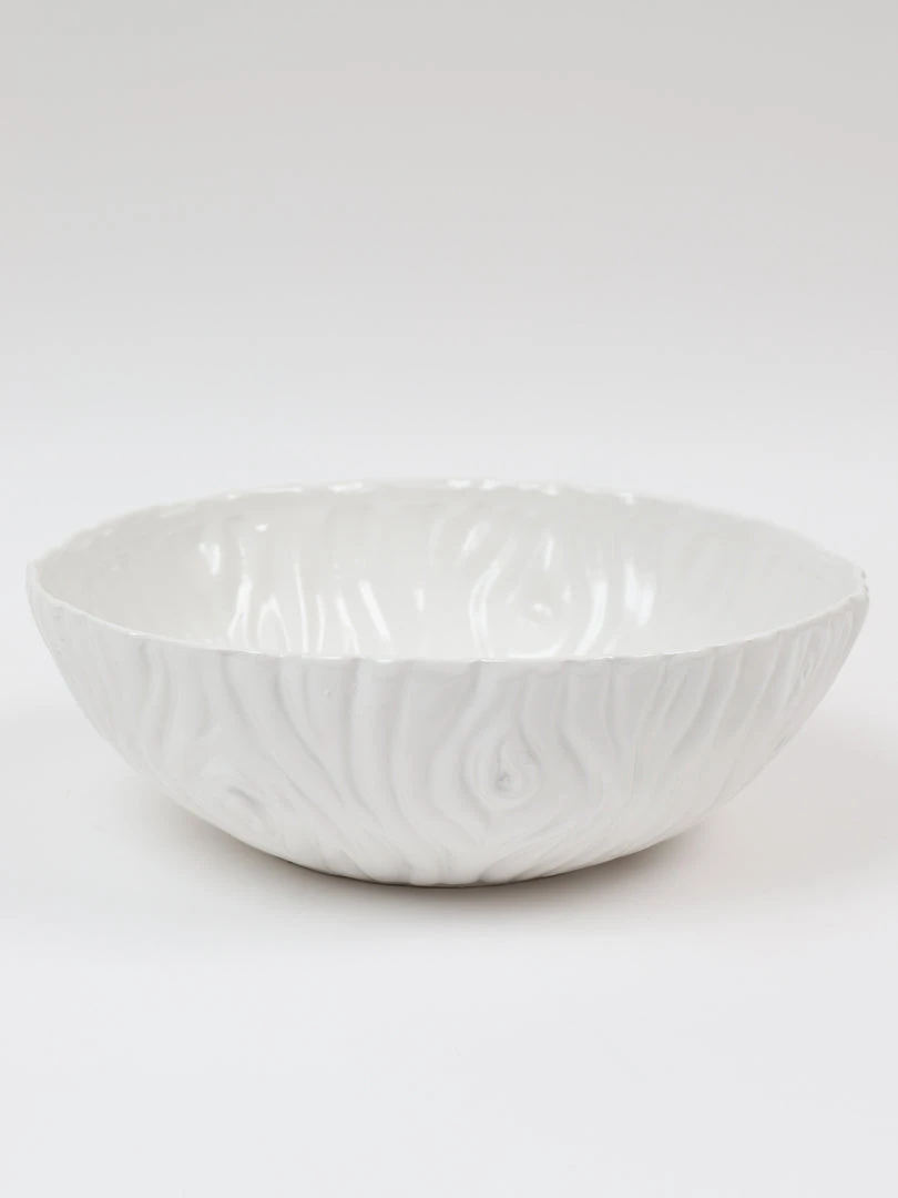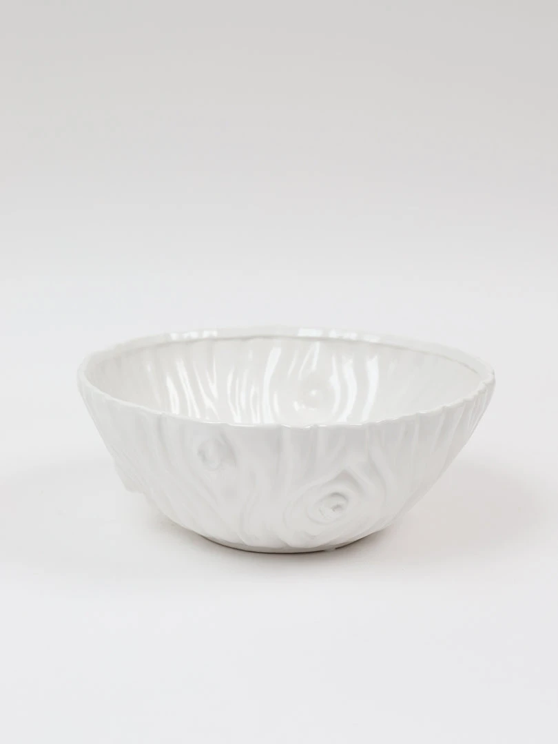 Description: These white ceramic bowls feature a wood grain texture and are perfect to hold your favorite florals or fruits! We love the clean look!