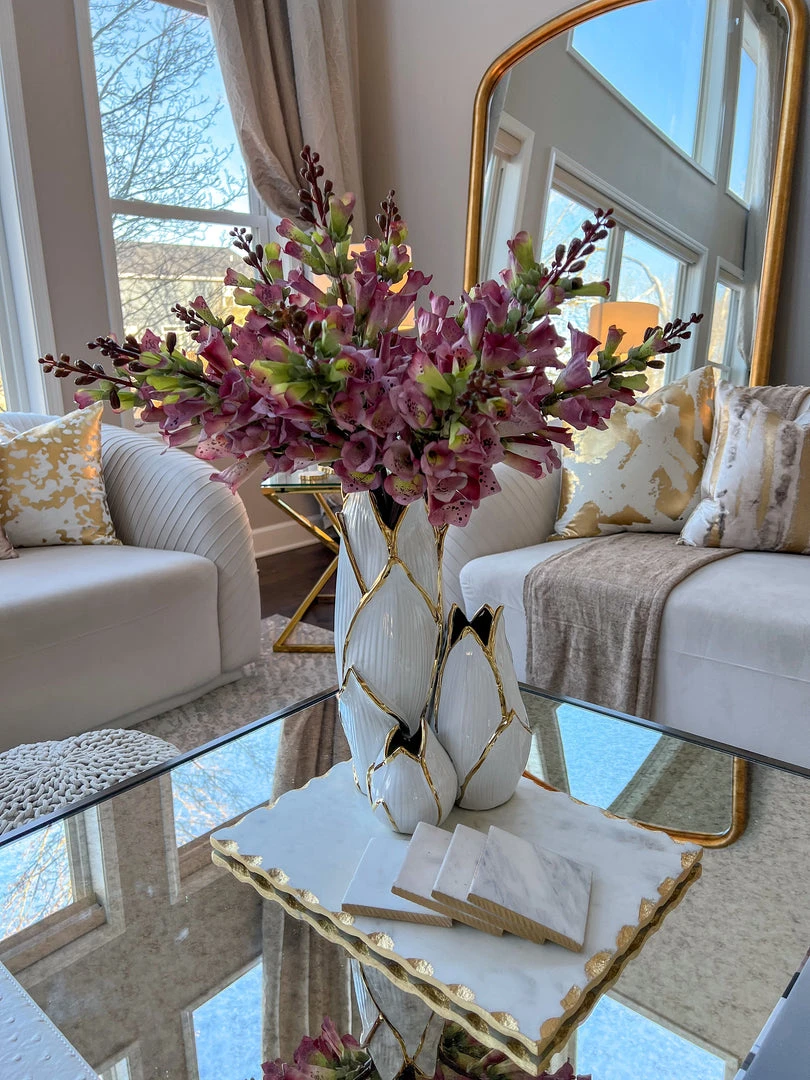 Description: This is a gorgeous and unique white and gold petal design cluster vase with 3 openings and is sure to become one of your favorite IMHD vases.