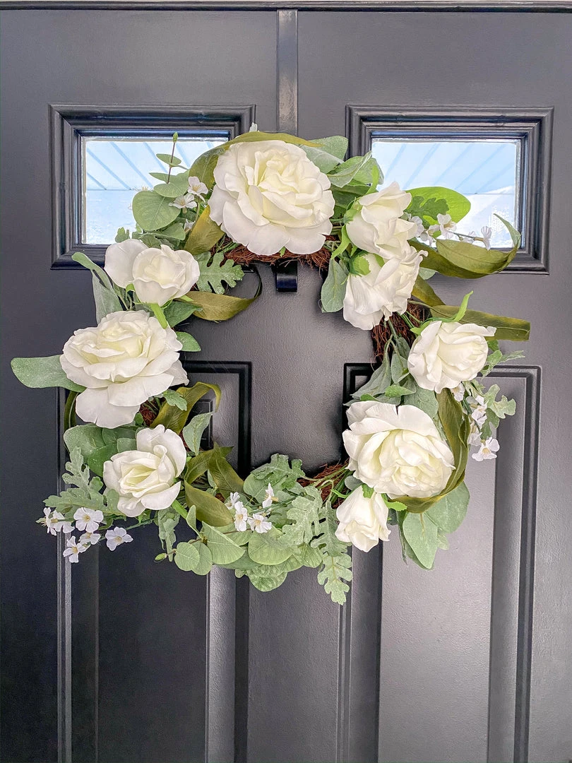 Description: This faux floral wreath features white roses and eucalyptus leaves and is so fresh and inviting! We love it styled on a front door!