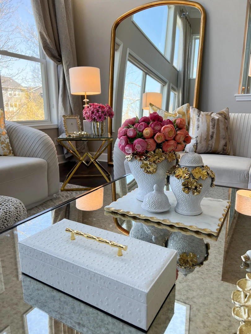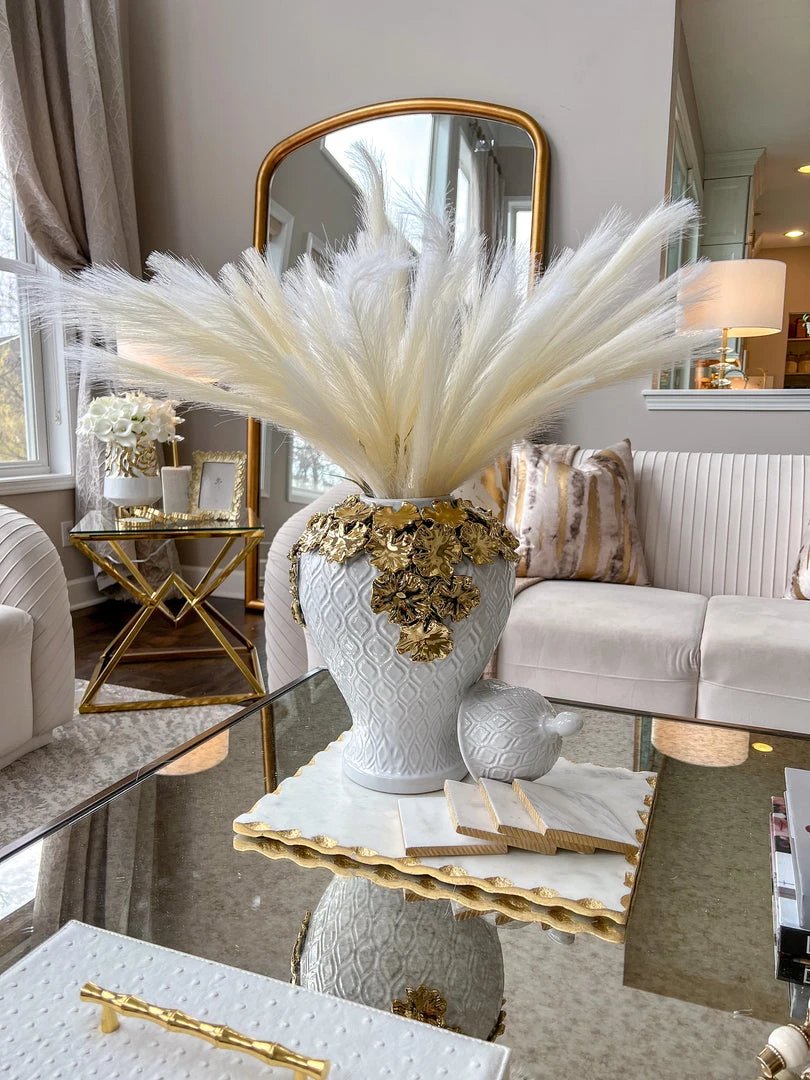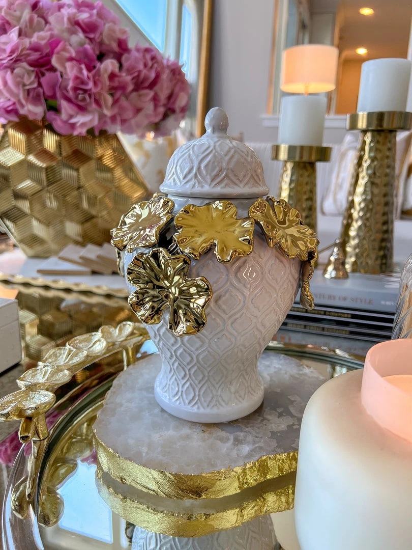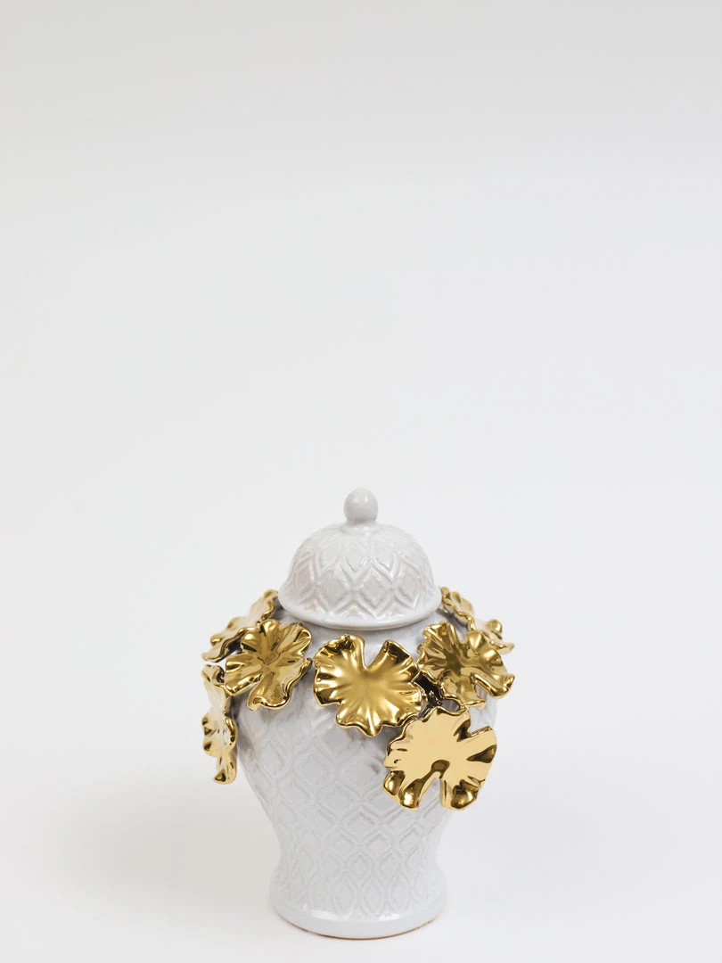 Description: These white textured ginger jars with their gold floral details are simply stunning!