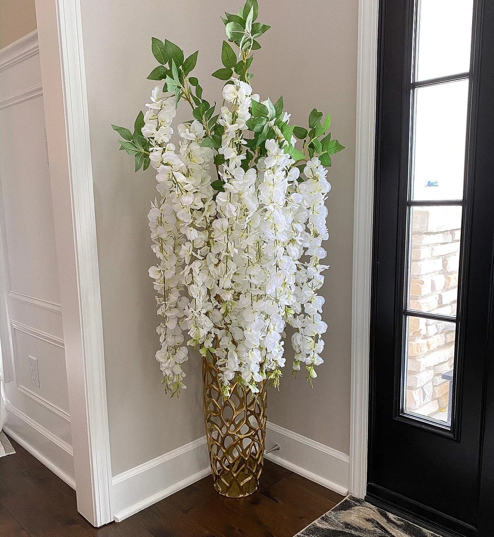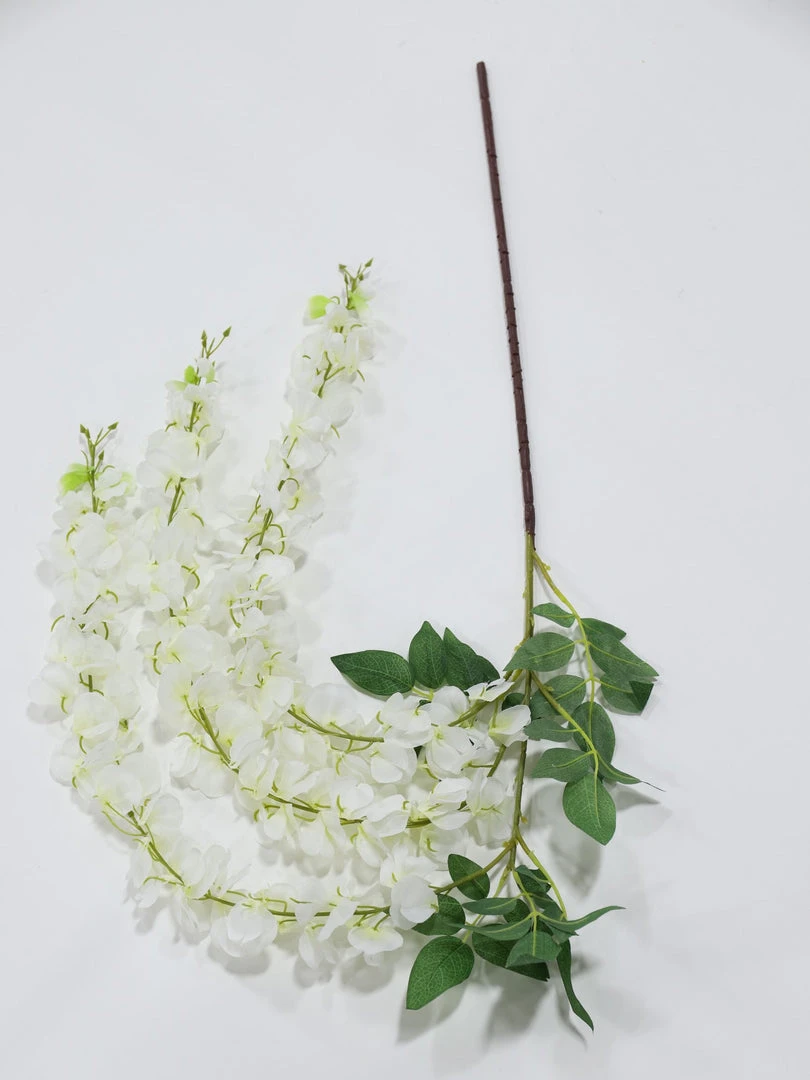 Description: This white wisteria stem is perfect for a large vase with some dazzling florals! The cascading blossoms and delicate leaves will look elegant and beautiful in any room of your home!