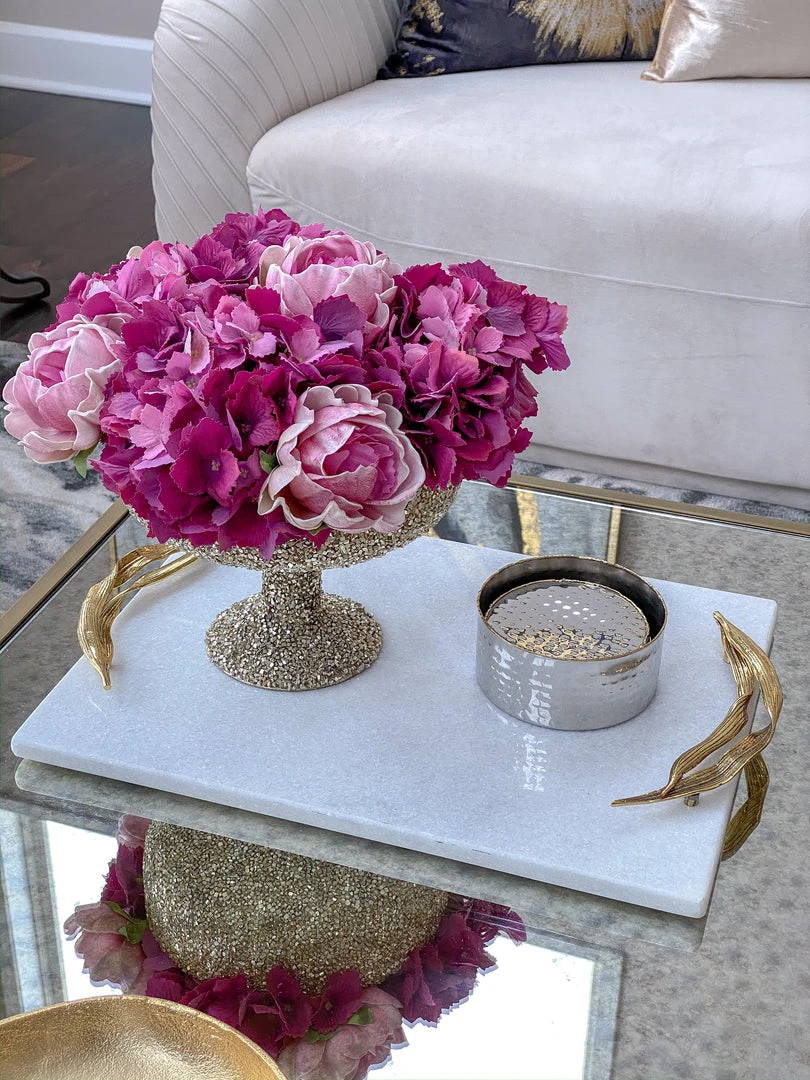 This white marble tray features beautiful gold handles shaped as thin leaves. Perfect for displaying hors d’oeuvres or other beautiful decor pieces.